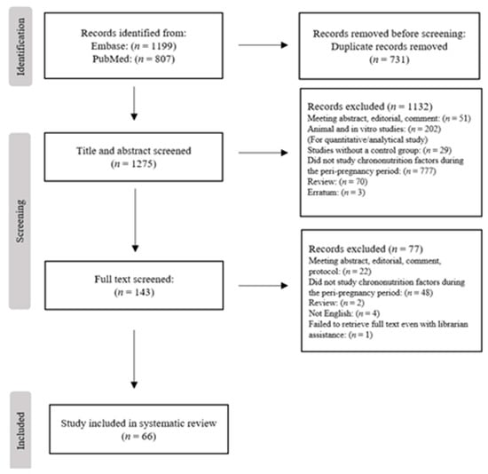We excluded (1) meeting abstracts, comments, editorials, study protocols, reviews, and meta-analyses; (2) animal studies and in vitro studies; (3) studies that did not study chrononutrition factors during the peri-pregnancy period in relation to maternal or child outcomes; (4) studies without a control group (e.g., case reports and series); and (5) articles not written in English.