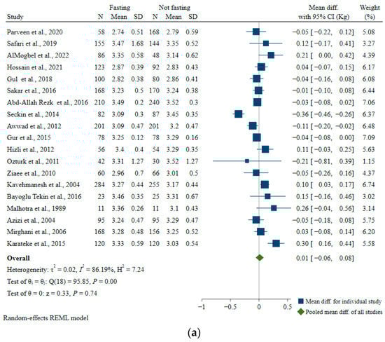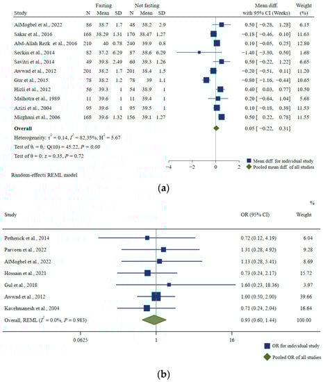 Due to the mostly heterogenous results from the included studies with various definitions of exposure and outcomes, especially for non-Ramadan studies involving various aspects of maternal chrononutrition factors, most of the results and discussions were narrative (i.e., without meta-analysis). However, since there was a sizeable number of studies involving Ramadan fasting and birth weight/low birth weight and gestational age at birth/preterm birth, we conducted meta-analyses to generate summary estimates. A smaller number of studies also looked at the influence of Ramadan fasting on common maternal outcomes (blood glucose and weight gain), and we pooled these estimates as well.