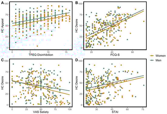 Representative selection of significant effects observed for associations with high-calorie (HC) food ratings (variables selected were ones in which significant effects were also observed for low-calorie (LC) food ratings, as shown in Figure 2). Significant associations were observed between: (A) HC appeal ratings (“Appeal”) and scores on the Three Factor Eating Questionnaire (TFEQ) disinhibition subscale (F(1,301) = 47.45, p < 0.001); (B) HC desire to eat ratings (“Desire”) and Food Cravings Questionnaire (FCQ-S) scores (F(1,301) = 137.24, p < 0.001); (C) HC desire to eat ratings and visual analog scale (VAS) ratings of satiety (F(1,301) = 20.32, p < 0.001); (D) HC desire to eat ratings and State-Trait Anxiety Inventory (STAI) scores (F(1,301) = 20.32, p < 0.001).