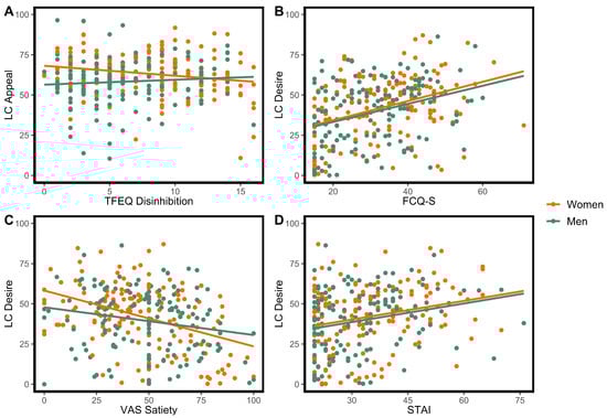 After adjusting for age and sex, a significant effect was observed for LC appeal ratings and disinhibition, potentially driven by increased disinhibition being associated with reduced LC appeal ratings in women (Figure 2A). Additionally, higher ratings of desire to eat LC food images were significantly associated with higher VAS hunger and increased food cravings (Table 3; see Figure 2B), as well as reduced VAS satiety (Figure 2C) and increased anxiety (Figure 2D), but these effects were not significant for LC appeal ratings.