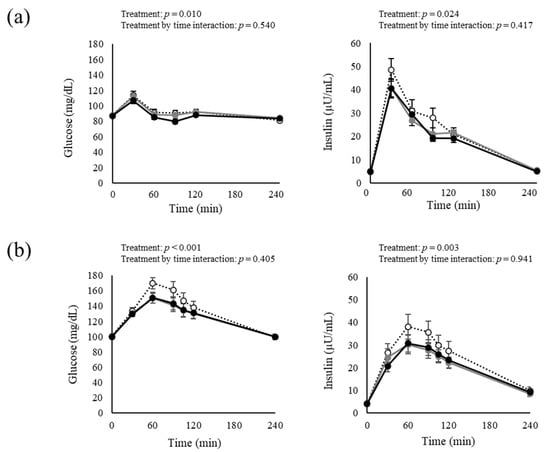 Microsoft Excel 14.0, SPSS version 28.0 (IBM Corp., Armonk, NY, USA) and SAS version 9.4 (SAS Institute Inc., Cary, NC, USA) were used for the statistical analysis. Data are expressed as mean ± standard error of the mean (SEM). The AUCs were calculated using the trapezoidal rule, maximum concentration (Cmax), and effect size, and the 95% confidence interval (CI) was calculated based on measurements at each time-point for the primary and secondary outcome measures. The following statistical analyses were performed among the three test beverage conditions. The values at each time-point were determined for each participant and entered into a linear mixed-effmixed-effect model with the treatment, time, and treatment-by-time interaction as the fixed effects. The significance of the total AUC (tAUC) and incremental AUC (iAUC) was analyzed using a mixed-effect model with adjustment of the effects of period and order by the “SAS GLIMMIX procedure” which allows statistical models to be fitted when responses are not necessarily normally distributed, and the effect of each test beverage was estimated with the “ESTIMATE” statement. Significance was estimated using empirical variance (“EMPIRICAL” option). An unstructured (“type = UN”) variance-covariance matrix in the data with repeated measures was assumed. The Tukey–Kramer method was used to adjust for statistical multiplicity. In addition, stratified and correlation analyses were performed according to subject characteristics. In all of the analyses, the significance level was set at 5%.