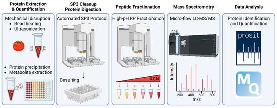 Briefly, finely powdered tomato fruits were subjected to metabolite extraction and protein precipitation with 2 mL of pre-chilled 10% trichloroacetic acid (v/v) in acetone. After overnight incubation at 4 °C, samples were centrifuged (15,000× g, 5 min, 4 °C). The pellet was washed three times with pre-chilled acetone, then air dried and resuspended in 1 mL of SDS extraction buffer (4% SDS, 150 mM Tris-Cl, pH 8.8, 1 mM EDTA, and 2 mM phenylmethylsulfonyl fluoride (PMSF)), followed by incubation at 60 °C for up to 1 h until the pellet had completely dissolved. Samples were then centrifuged to remove cell debris (15,000× g, 10 min, RT). An equal volume of Tris-saturated phenol (pH 7.5–8) was added to the supernatant and vortexed for 1 min. The phenolic phase was separated by centrifugation (15,000× g, 5 min, RT). The proteins were precipitated overnight at −20 °C with 1 mL of 0.1 M ammonium acetate in methanol. Protein pellets were obtained by centrifugation (15,000× g, 10 min, 4 °C). The pellets were washed once with 0.1 M ammonium acetate in methanol and twice with precooled 80% acetone (v/v) and then air dried. Finally, proteins were re-solubilized in 250 μL SDS-containing lysis buffer (4% SDS, 40 mM Tris-Cl, pH 7.6), followed by sonication using an R230 focused-ultrasound instrument (Covaris Ltd., Brighton, UK, 300 s duration, 30 s on/off) and a final centrifugation step (21,000× g, 60 min, 4 °C). Proteins were quantified using a bicinchoninic acid assay (BCA, Thermo Pierce).
