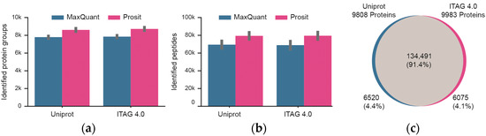 Summary of peptide and protein identifications of technical workflow replicates (n = 4). (a) Identification of proteins when searching the Uniprot or TAG 4.0 sequence databases and either including or excluding re-scoring of MaxQuant results using the artificial intelligence Prosit. Black bars represent one standard deviation. (b) Same as panel (a) but for peptides. (c) Venn diagram showing the overlap of peptides identified from Uniprot or ITAG 4.0.