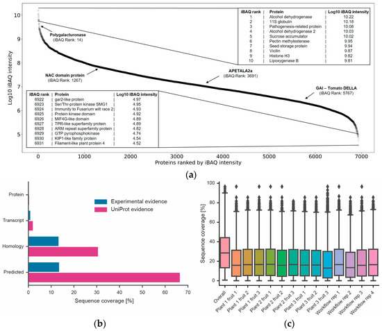 Dynamic range of proteome expression, discovery of new proteins and amino acid sequence coverage. (a) Ranked protein abundance plot and gene names of the 10 most highly expressed proteins and 10 least highly expressed proteins covered by the data. Four proteins important for tomato fruit development are also highlighted [38]. (b) Percentage of all tomato genes divided by difference evidence levels according to UniProt (orange). Blue bars represent proteins identified in this study. (c) Box plots showing the distribution of amino acid sequence coverage for proteins identified in each experiment or when combining all data into one analysis.