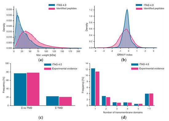 Assessment of workflow bias. (a) Distribution of the molecular weights of all proteins in ITAG 4.0 vs. proteins identified in this study; (b) same as panel (a) but for peptide hydrophobicity (expressed as GRAVY index). (c) Fraction of proteins with or without predicted transmembrane domains (TMF) in ITAG 4.0 or identified in this study. (d) Percentage of proteins with different numbers of predicted transmembrane domains in ITAG 4.0 or identified in this study.