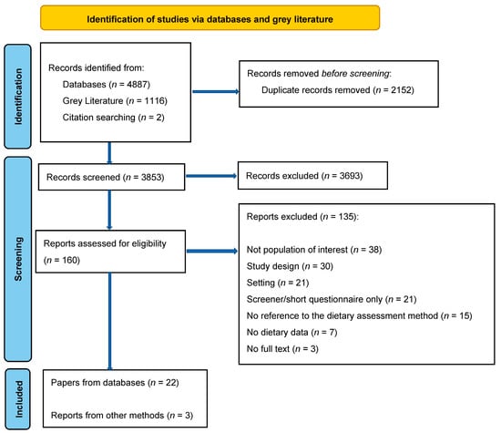 Databases, grey literature, and citation searching identified a total of 6005 records. A total of 2152 duplicates were removed. The titles and abstracts of 3853 records were then screened and 3693 records were excluded. A full text review of 160 records was carried out to assess eligibility and 135 records were excluded. The main reasons for exclusion were a focus on a population that did not fit the inclusion criteria (n = 38), an ineligible study design (n = 30) or setting (n = 21), or the dietary assessment method being a screener or short questionnaire (n = 21). Other reasons for exclusion included records which did not contain a reference to dietary assessment methods (n = 15), no dietary data (n = 7) or no full text (n = 3). The PRISMA flow diagram details the selection process (see Figure 1).