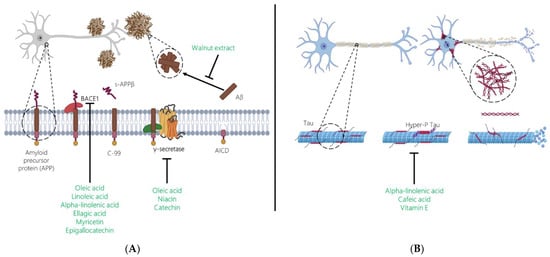 Alzheimer´s Disease Hallmarks (A) amyloid-beta (Aβ) deposition and (B) neurofibrillary tangles of hyperphosphorylated tau. Effects of nut bioactives on critical pathways are shown.