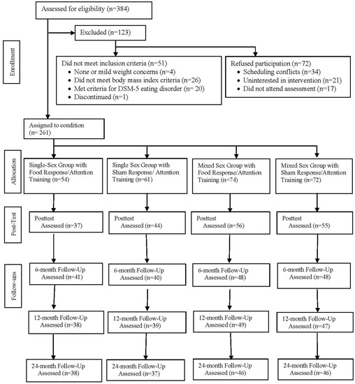 A report on the acute effects from this trial confirmed that Project Health produced significantly larger body fat loss by posttest when delivered in single- versus mixed-sex groups and when paired with the food response inhibition and attention training versus sham training [14]; and further, that these two factors interacted, producing the largest body fat loss for single-sex groups implemented with food response inhibition and attention training. Although the two manipulated factors did not affect eating disorder symptoms, there was a large reduction in symptoms across conditions (within-participant d = 0.78), that was larger than the within-condition symptom reduction (d = 0.54) observed in a past trial in which Project Health produced greater symptom reductions than educational controls [19]. The present report describes the intervention effects over a 2-year follow-up.