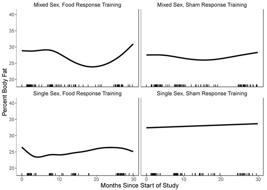To examine continuous outcome change by single-sex versus mixed-sex group and food response and attention training versus sham training, we fitted generalized additive models (GAM). GAMs were used because outcome change was nonlinear. These analyses were intent-to-treat and included all participants randomized to the conditions. Because participants in the four conditions differed on baseline percent body fat (F3, 251 = 5.63, p = 0.001), all analyses were controlled for baseline percent body fat. Interactions for GAMs were examined by fitting separate smooth functions of time for each intervention condition. To examine interactions of time with the four conditions, we fitted five models. First, we fitted a model with a three-way interaction between time, group-type, and response training-type (all models included lower order interactions and main effects) and random effects for intercept and slope. Second, we fitted a model with a two-way interaction between time and group and time and response type modeled as random effects. Third, we fitted each two-way interaction separately in their own model. Finally, we fitted a model with no interactions with time. These models were compared using the Akaike Information Criterion (AIC) [39]. Models with the lowest AIC best fitted the data and models that differ by less than seven were considered to have a comparable fit [40], in which case, we selected the more parsimonious model. We also conducted complier analyses that only included participants who attended five or six of the Project Health sessions, to provide a description of the intervention effects for participants who completed most of the intervention.