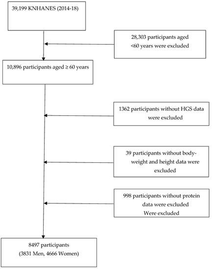 The data for this study were collected as part of the Korean National Health and Nutrition Examination Survey (KNHANES), a large, nationwide study of the South Korean general population. The survey, conducted by the Korea Centers for Disease Control and Prevention, includes a diverse, representative sample of non-institutionalized South Koreans. The survey uses a complex sampling design that involves stratification and clustering of the samples to ensure that they are representative of the overall population. The data, collected through a rolling survey process over the 2014-18 period, included a total of 39,199 participants. Of these, 10,896 adults 60 years of age or older were chosen for further analysis. Further exclusions, due to participants’ lacking complete information on HGS (n = 1362), body weight and height (n = 39), or protein intake (n = 998), meant that there remained 8497 participants eligible for inclusion in the study (Figure 1). All of the KNHANES participants agreed to the study’s use of their data by signing written consent forms, and, according to the Bioethics and Safety Act, no additional ethical review was necessary.