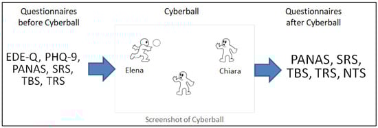 The study used a single-session design. After signing the consent form, participants completed the self-report questionnaires (EDE-Q, PHQ-9, PANAS, SRS, TBS, and TRS) and were randomly assigned to play either the exclusion or overinclusion block of the Cyberball game. The game was always played in the afternoon and in the same room, using a 17-inch laptop. After playing the game, participants completed the NTS, rated the percentage of ball tosses received, and completed the post-test self-report questionnaires (PANAS, SRS, TBS, and TRS). Finally, participants were debriefed according to the international guidelines regarding deception []. See Figure 1 for a graphical representation of the procedure.