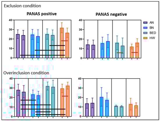 Graphical representation of the PANAS scores, with means and standard deviations. For all the pairs of bars, the one on the left is pre-Cyberball, and the one on the right is post-Cyberball. The bars show the presence of a significant difference between pre and post comparisons (red bars) or between diagnoses (black bars).