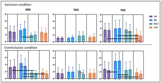 Evaluation of the perception of ball passes showed that all the subgroups could discriminate between exclusion and overinclusion in the ball-toss game; our results confirmed preliminary evidence about the ability of AN patients to determine the nature of a social scenario [,] and added new data for patients with BN and BED. For participants’ perception of their overinclusion or exclusion in the game, more significant differences emerged during the overincluding paradigm, confirming that social comparison is a vulnerability aspect that should be carefully considered when treating ED patients [].
