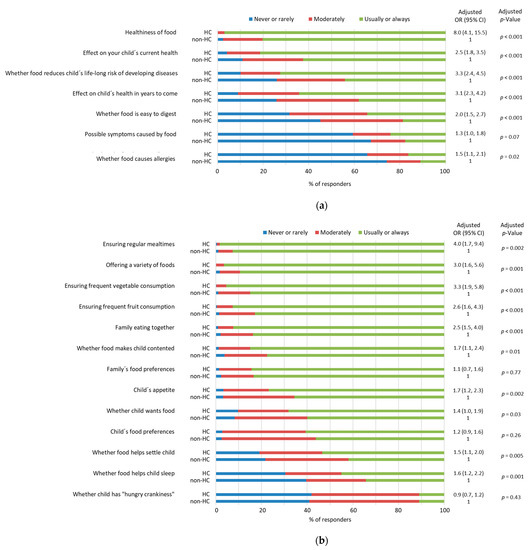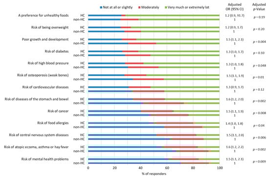 Moreover, HC parents were more likely to consider the probability that their child was eating a diet that would reduce her/his lifelong risk of developing diseases than non-HC parents (adjusted OR 2.8, 95% CI 1.9−3.9, adjusted p < 0.001, Figure S4). This also applied to the likelihood of HC parents answering that they were willing that their child would have a diet that would reduce her/his lifelong risk of developing diseases (adjusted OR 2.1, 95% CI 1.2−4.0, adjusted p = 0.02) and that they are able to regulate their child’s feeding so that it would reduce their child´s lifelong risk of developing diseases (adjusted OR 2.6, 95% CI 1.9−3.6, adjusted p < 0.001, Figure S4).