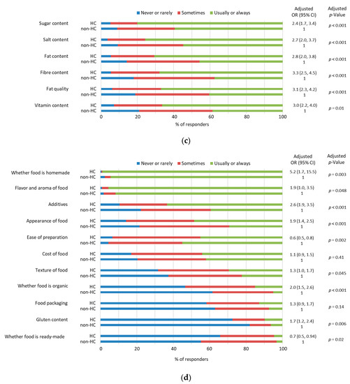 In general, when selecting meals for their child, HC parents were more likely to consider factors related to the child’s health, child´s eating behavior, and nutrient composition of food as well as the food’s composition, appearance, and preparation (Figure 1a–d). The ease of food preparation was more likely to be considered by the non-HC parents than the HC parents (Figure 1d). In more detail, HC parents more likely considered the effects of diet on the child´s current and long-term health, i.e., whether the food was associated with a reduction in the lifelong risk of developing diseases when the child was older, and the healthiness of the food as compared to non-HC parents (Figure 1a). While ensuring regular mealtimes and frequent consumption of vegetables and fruits by the child as well as eating together with the whole family emerged in both of the groups, it was more likely to be considered in HC parents (Figure 1b). Of the factors regarding the nutrient composition of food (Figure 1c), in both groups of parents, the sugar content of the foods they gave their child was most commonly considered. Of the factors related to food composition, such as its appearance and preparation (Figure 1d), the most often considered factor by all parents was whether the food was homemade as well as its flavor and aroma. Whether the food was organic or ready-made was considered rather rarely in both groups.