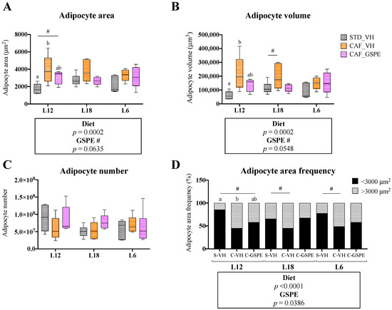 Adipocyte area (A), adipocyte volume (B), adipocyte number (C) and adipocyte area frequencies (D) of epididymal white adipose tissue (eWAT) of rats treated with grape seed proanthocyanidin extract (GSPE) at different photoperiods, 12 h of light:12 h of darkness (L12); 18 h of light:6 h of darkness (L18); 6 h of light:18 h of darkness (L6). Histological study of eWAT morphology of Fisher 344 rats fed with standard diet (STD) or cafeteria diet (CAF) for 9 weeks and treated with GSPE (25 mg/kg body weight) or vehicle (VH) the last 4 weeks of the study; STD-VH group; CAF-VH group; CAF-GSPE group, under different photoperiods; L12, L18 or L6. For adipocyte area frequency, adipocytes were distributed in two groups according to their areas (<3000 or >3000 μm2). The results are presented as the mean ± SEM (n = 6). Significant differences were assessed through two-way ANOVA analysis (p < 0.05). Diet: diet effect within VH groups; GSPE: GSPE consumption effect within CAF groups; #: tendency (0.05 < p < 1). Different letters denote significant differences within each photoperiod group (assessed with one-way ANOVA followed by Tukey’s post hoc test, p < 0.05; #: tendency: 0.05 < p < 1).