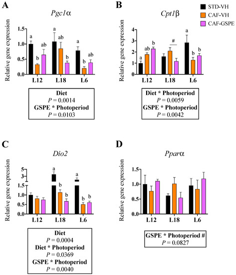 Moreover, Cd36, Lpl, Pparγ, and Prdm16 gene expression was significantly downregulated by the CAF diet in all animal groups (Supplementary Figure S6). However, an interaction effect between GSPE and photoperiod was observed in the gene expression of Pparα, which tended to be upregulated in the L12 and L6 groups but not in the L18 animals (Figure 5D).