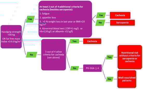 Information about weight loss does not identify all relevant pathophysiologic changes of clinical importance. The diagnosis of malnutrition in everyday clinical practice is often inappropriately based on weight loss only. According to the definition of cancer cachexia, we should focus on the ongoing loss of skeletal muscle mass (with or without fat mass loss) []. However, the identification of patients with muscle loss is problematic because it is not recognized with BMI measurement only. Also, 40–60% of cancer patients are overweight or obese, according to the World Health Organization criteria (WHO). Even in metastatic disease, sarcopenic obesity is frequently overlooked [,]. The strength of our study lies in diagnosing the NS according to terminology for nutritional disorders []. We categorized NS by the algorithm based on body composition, muscle strength, and laboratory parameters (Figure 1).
