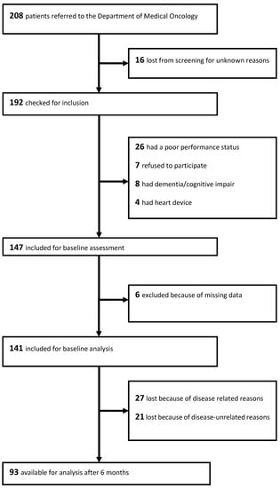 As previously described, we screened 208 patients and enrolled 141 patients in this study 6. Of these, 93 (66%) were evaluated for the HRQoL at the assessment six months later; there were missing data for disease-related reasons and unknown reasons in 27 (19.1%) and 21 (14.9%) patients, respectively (Figure 2). At the cut-off date 102 (72%) patients were dead.