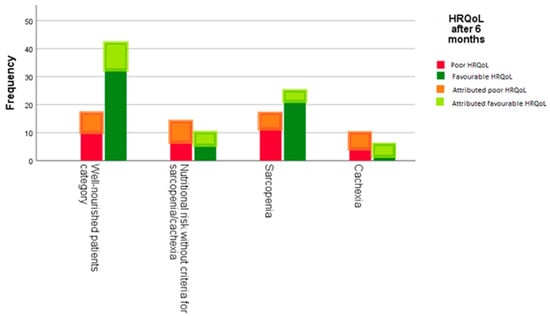 Figure 3 presents actual and attributed HRQoL in each NS category, including attributed data for patients not assessed for HRQoL due to unknown reasons according to the best-case scenario. The WN patients have the lowest odds of having poor estimated HRQoL compared with other groups (Table 2). In the model of univariate logistic regression, we found that patients with NR and cachexia had a significantly higher chance of worse estimated HRQoL than WN patients (OR 3.45; 95% CI [1.28 to 9.09] and OR 4.17; 95% CI [1.28 to 12.5], respectively). Although there was a similar numerical trend for sarcopenia, this association was not statistically significant (Table 2). In the multivariate model trend for the negative association between NR, cachexia, and estimated HRQoL remained, but statistical significance was lost. Pain at baseline was the only significant negative predictor for estimated HRQoL at six months (Supplementary Table S4). When considering the worst-case scenario, results have not been substantially different (Supplementary Figure S3).