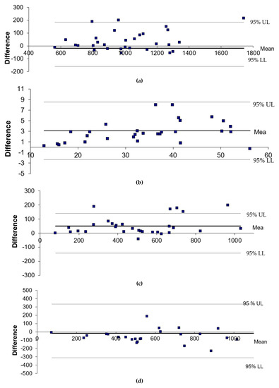 - Bland, J.M.; Altman, D.G. Statistical methods for assessing agreement between two methods of clinical measurement. Lancet 1986, 1, 307–310. [Google Scholar] [CrossRef]