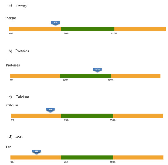 Nutricate© is a user-friendly web application developed by Nutricia (LS) by adhering to guidelines related to the data collection of dietary information, with the goal of estimating the levels of some nutrient intakes [24]. The use of subject-based computerized food data intake was previously used in the HELENA study [25]. The Nutricate© web application collects dietary intake data (infant formula, nutritional supplements, and foods and beverages) based on the 24-hour dietary recall (24HDR) method. Parents were asked to report the daily average of food intake over a one-week period prior to the collection date. The 24HDR collection frame was presented based on a standardized meal sequence of breakfast, lunch, and dinner (Figure 1a). This 24HDR data collection frame was previously used by Thompson et al. [26]. Each meal sequence presented pictures of increasing portion size (Figure 1b) using the same process developed by Hercberg et al. [27] containing pictures of several foods and beverages [27,28]. After 24HDR completion and validation by parents, the Nutricate© web application automatically generated a password. This password allowed access to an individual dietary report with specific macro/micronutrient intake values (Table 2). The quantities of each food and beverage category reported in the Nutricate© software was automatically linked to the French food composition database (CIQUAL/ANSES food table; https://ciqual.anses.fr/ accessed on the 10 July 2020). In order to present a short list of foods, some foods were merged into one category (presented in Supplementary Table S1 with their correspondence in the French food composition database). For instance, all animal-protein-rich foods (i.e., white/red meat, fish, ham, and egg) were merged into one category. The repartition of all animal-protein-rich foods was computed according to one category, similar to the repartition used in the INCA study of French infants (0–6 years) [29]. In this context, Supplementary Table S1 presents correspondence between some created, merged food categories and their macronutrient contents. Supplementary Table S1 presents present data for animal-protein-rich foods, starch, vegetables, and fruits.