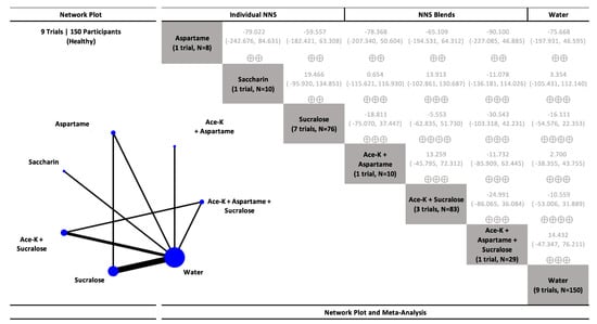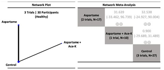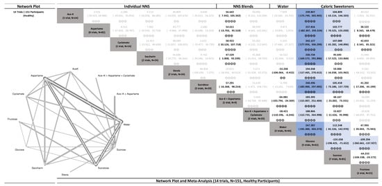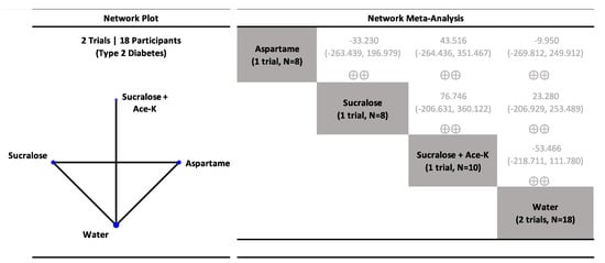 - Khan, T.A.; Kendall, C.; Sievenpiper, J. Systematic Review and Network Meta-Analyses of Low-Calorie Sweeteners and Acute Glycemic Response. 2020. Available online: https://doi.org/10.17605/OSF.IO/QSZBP (accessed on 7 May 2020).