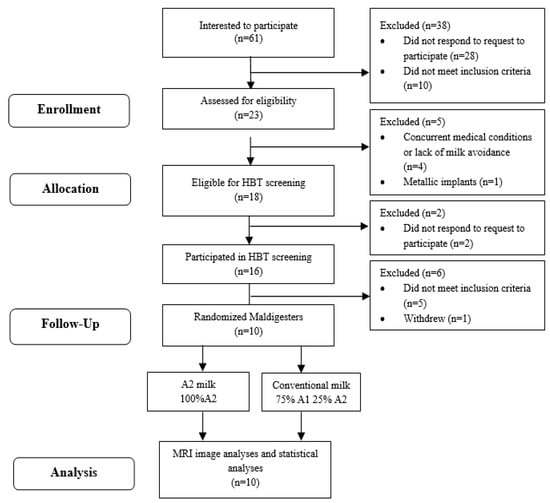 This was a randomized, double-blinded, crossover trial. Subjects aged 18–65 years were recruited using flyers, advertisements in local and campus newspapers and email. The recruitment started in March 2021 and the data collection was completed in October 2022. Sixty-one people indicated an interest in the study and contacted the study staff through email or phone (Figure 1). An informed consent with a detailed study procedure and eligibility criteria was sent for review to interested subjects. Twenty-eight people were phone screened with queries regarding medication use, demographic information and body mass index (BMI) and were then classified as eligible or ineligible (Appendix A). Eligible subjects were assigned an identification number, provided written informed consent and were enrolled. Research Randomizer (randomizer.com, (accessed on 28 June 2021) was used to generate the randomization. Thirty sets of numbers (from 1–30) were randomly assigned in an order of 1 (conventional milk) and 2 (A2 milk). Eligible subjects were sequentially assigned to the numbers. Staff performed the randomization, enrolled subjects and assigned the randomized intervention to participants. The randomized milk type was sent to the clinical research center (CRC) kitchen staff via email and milk was poured into containers labeled with the subject ID. The milk type was not indicated in the containers. Study staff who assessed the outcomes and study participants were blinded to treatment. Subjects identified themselves as milk intolerant or milk avoiders. Lactose maldigesters were identified with a 20 ppm increase in hydrogen between any two time points during a 6-h hydrogen breath test (HBT) after a milk challenge dose of 0.5 g of lactose/kg body weight [19].