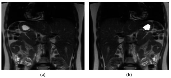 Image analysis using FMRIB’s Software Library (FSL v5.0.11). (a) Magnetic resonance image of the stomach 10 min after drinking milk. (b) Magnetic resonance image of the stomach with the mask of the milk content.
