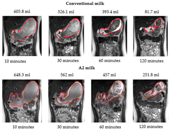 Magnetic resonance images showing the gastric volume of conventional milk and A2 milk and volume calculated in milliliters (mL) at 10, 30, 60 and 120 min.