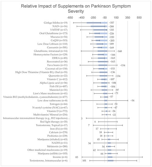 After adjusting for age, gender, income and years since diagnosis, individuals reporting consistent use of the following supplements reported fewer PD symptoms statistically over time: Ginkgo biloba (β = −357, CI95%: −592–−122), NAD+ (β = −288, CI95%: −532- −45), 5-methyltetrahydrofolate (5-MTHF) (β = −241, CI95%: −469–−13), oral glutathione (β = −226, CI95%: −311–−141), mucuna (β = −220, CI95%: −257–−83), coenzyme Q10 (β = −203, CI95%: −270–−136), low-dose lithium (β = −189, CI95%: −291–−86), curcumin/turmeric (β = −169, CI95%: −237–−100), homocysteine-lowering b-vitamin complex (e.g., vitamin B6, B12, folate, betaine) (β = −166, CI95%: −260–−73), dehydroepiandrosterone (DHEA) (β = −163, CI95%: −275–−51), coconut oil (β = −153, CI95%: −239–−67), vitamin C (β = −107, CI95%: −171–−43), and fish oil (β = −104, CI95%: −169–−39), (all p < 0.05) (Figure 2).