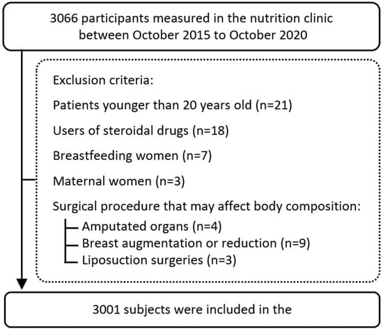 In this single-center cross-sectional observational study, 3001 participants attending a private nutrition clinic in the center of Israel were enrolled between October 2015 and October 2020. Study participants visited the clinic for nutrition consulting to improve their well-being, change lifestyle habits, or lose weight. Among the entire study population, 51.9% of the participants were male with a large range of BMI (14.7–59 kg/m2), and from different races, which represent well the general population in Israel. Participants were excluded from the study if they were lactating (n = 7), users of steroidal drugs (n = 18), or had undergone a surgical procedure that could affect body composition [e.g., amputated organs (n = 4), breast augmentation or reduction (n = 9), and liposuction surgeries (n = 3)]. Demographic parameters, including age and sex, were collected, as well as the medical history of bariatric surgery (n = 136), thyroid disorders (n = 46), or diabetes (n = 115) based on the clinical records. Furthermore, we classified the participants (n = 2937, 97.9% of the study sample) based on self-reported previous weight loss attempts: never (n = 2109), one or two attempts (n = 625), or three or more attempts (n = 203). The study flow chart is shown in Figure 1. Data collection and analysis were by the relevant ethical codes and were approved by the Ethics Committee of Tel Aviv University (0000607-2).