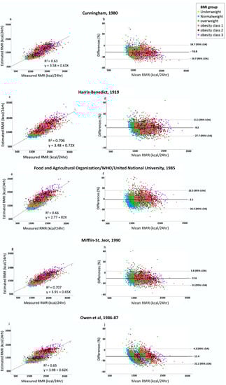 - Frankenfield, D.; Roth-Yousey, L.; Compher, C. Comparison of Predictive Equations for Resting Metabolic Rate in Healthy Nonobese and Obese Adults: A Systematic Review. J. Am. Diet. Assoc. 2005, 105, 775–789. [Google Scholar] [CrossRef]