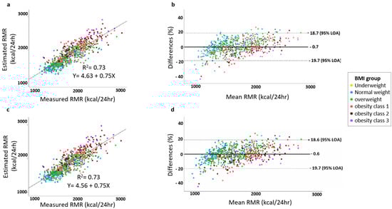 Bland–Altman analysis of the proposed new models applied to the validation set (n = 750). The x-axis represents the mean of the measured and estimated RMR, and the y-axis expresses the difference in percentage between the RMR predicted using each of the equations and the RMR measured as follows: (pRMR − mRMR/mRMR)/100). Lin’s concordance correlation was used to determine the R2 and the linear equation between each estimated equation and the measured RMR. (a,b) model 1, includes sex, age, FM, and FFM. (c,d) model 2, includes sex, age, FM, FFM, and the interaction between FM and FFM (FM*FFM).