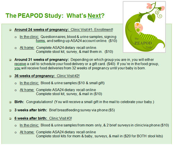 Pregnant participants were recruited from a single prenatal care clinic serving a rural population in the northwest region of Michigan’s Lower Peninsula. Inclusion criteria were maternal age of at least 18 years, pregnant with a gestational age of approximately 22 weeks at enrollment, and no self-reported contraindication to increasing dietary fiber. Inclusion criteria were broad in an attempt to enroll a sample generally representative of the area, but we did restrict enrollment to those women living within a three-county region because of the food delivery component. All participants met in-person with a research assistant to complete the informed consent process and receive oral and written directions about the next steps of the study. The PEAPOD study was approved by the Institutional Review Boards at Michigan State University (#16-1515) and Munson Medical Center (#1026493).