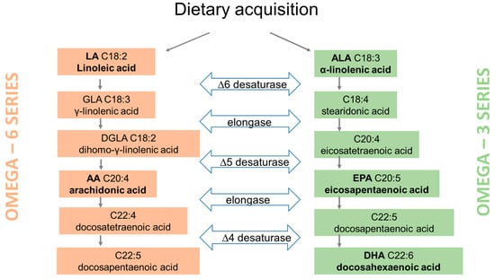 PUFAs originate from primary producers (photosynthetic marine and freshwater microalgae and bacteria) in food webs and animals can only modify them by bioconversion and elongation [5]. Humans do not possess enzymes capable of forming double bonds in fatty acid chains and are therefore unable to produce LA and ALA in the sufficient amounts. Both LA and ALA give rise to essential unsaturated fatty acids of high physiological significance and therefore must be acquired through dietary sources (Figure 1). Once consumed through diet, more than 90% of FAs are absorbed into cells via FA transporters [6]. Once inside the cell, they are converted to FA acyl-CoA thioesters, which are substrates for three metabolic pathways: beta oxidation pathway for ATP production; synthesis of triglycerides, cholesterol esters and polar lipids (phospholipids and sphingolipids) and elongation/desaturation reactions generating long chain PUFAs from the initial C18 precursors. The latter conversion occurs in the endoplasmic reticulum through consecutive elongation and desaturation reactions synthesizing longer-chain PUFAs as shown in Figure 1 [7]. The substrates for the synthesis of longer PUFAs, LA and ALA, compete for the same enzymes (elongase and desaturase) and yield arachidonic acid (AA), eicosapentaenoic acid (EPA), and docosahexaenoic acid (DHA). The incorporation of PUFAs in cell membranes contributes to their fluidity, which plays an important role in determining correct hormone-receptor binding [8].