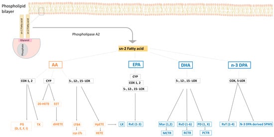 Metabolic pathways for n-6 (orange) and n-3 (blue) polyunsaturated fatty acids. COX, cyclooxygenase; CYP, cytochrome P450; CysLTs, cysteinyl leukotrienes; DHA, docosahexaenoic acid; DPA, docosapentaenoic acid; EET, epoxyeicosatetraenoic acid; EPA, eicosapentaenoic acid; HETE, hydroxy eicosatetraenoic acid; HpETE, hydroperoxy eicosatetraenoic acid; LTB4, leukotriene B4; LOX, lipoxygenase; LX, lipoxin; MaR, maresin; MCTR1, maresin conjugates in tissue regeneration 1; PCTR, protectin conjugates in tissue regeneration; PD, protectins; PG, prostaglandin; RvD, D-series resolvin; RvE, E-series resolvin; RvT, thirteen-series resolvin; Tx, thromboxane.