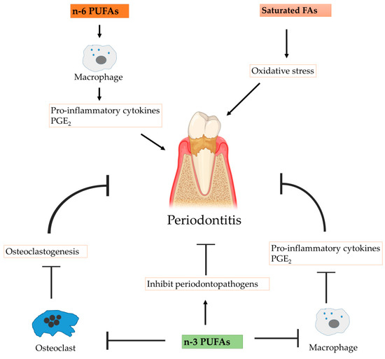 In addition to their anti-inflammatory actions, n−3 FAs also exhibit antimicrobial activity. Both EPA and DHA inhibit the activity of periodontal pathogens, such as Porphyromonas gingivalis, Fusobacterium nucleatum, and Prevotella intermedia [112]. Huang and Ebersole reported on the strong antibacterial activity of both EPA and DHA against oral pathogens, including Streptococcus mutans, Candida albicans, and Porphyromonas gingivalis (at 50% inhibitory concentration from 1 to 10 μg/mL) [123].