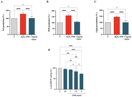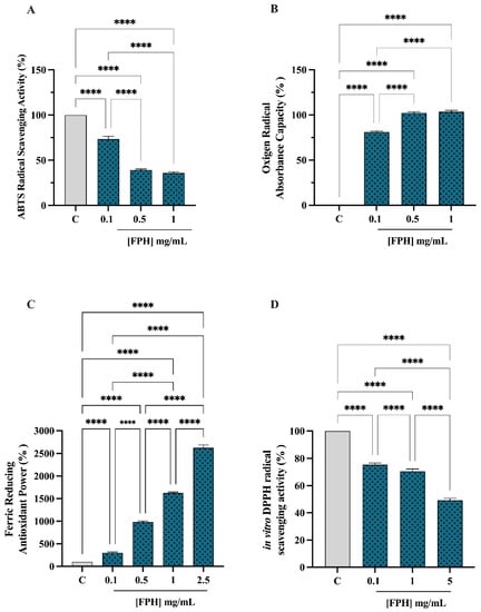 In vitro antioxidant power evaluation of the FPH by 2,2-azino-bis-(3-ethylbenzothiazoline-6-sulfonic acid (ABTS) (A), Oxygen Radical Absorbance Capacity (ORAC) (B), ferric reducing antioxidant power (FRAP) (C), and 2,2-diphenyl-1-picrylhydrazyl (DPPH) (D) assays. The data points represent the averages ± SD of three independent experiments performed in triplicate. All data sets were analyzed by one-way ANOVA followed by Tukey’s post-hoc test. C: control sample (H2O), ns: not significant, (****) p < 0.0001.