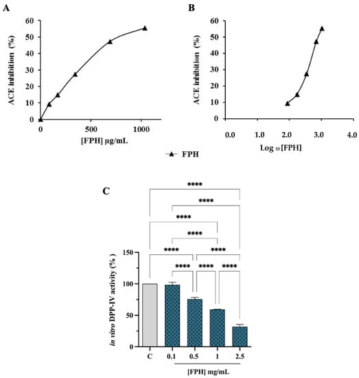 Evaluation of cell-free ACE and DPP-IV inhibitory activity of the FPH: results of % ACE inhibition vs. FPH concentration (µg/mL) (A); graphic report of % ACE inhibition vs Log10 FPH concentration; IC50 is the concentration needed to observe 50% inhibition of ACE activity (B); inhibition of the activity of human recombinant DPP-IV (C). The data are represented as the means ± SD of six independent experiments, performed in triplicate. Statistical analysis was performed by one-way ANOVA, followed by Tukey’s post-hoc test (****) p < 0.0001.