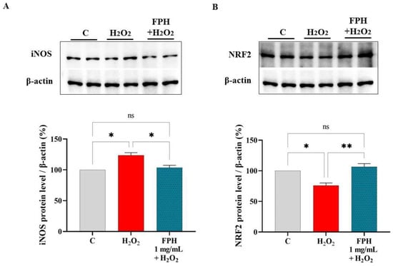 Effect of FPH on the H2O2 (1 mM)-induced iNOS (A) and NRF2 (B) protein levels in human intestinal Caco-2 cells. The data points represent the averages ± s.d. of three independent experiments in duplicate. All data sets were analyzed by one-way ANOVA followed by Tukey’s post-hoc test. C: control sample; ns: not significant; (*) p < 0.05, (**) p < 0.01.