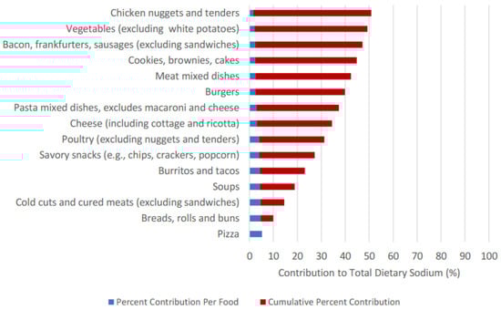 Nearly 90% of Americans consume sodium at levels which exceed amounts recommended by the 2015–2020 Dietary Guidelines for Americans [1]. Reducing population-level sodium intake can reduce blood pressure, an important preventative strategy to lower the risk of cardiovascular diseases, the leading causes of death in the United States [2]. It is well established that most dietary sodium is derived from prepackaged foods [3,4]. Efforts have been made to curtail population sodium intake through consumer education and food labelling campaigns, but have had minimal impact [5]. As a result, experts have recommended that sodium reduction in foods be a primary focus of public health strategies to achieve population-level sodium reduction [6]. To encourage the consumption of foods naturally low in sodium and effectively target the reduction of sodium levels in food, the identification of key food contributors to population-level sodium intake is crucial.