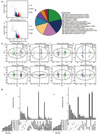 Principal component analysis of the metabolites. (A) Volcanic maps of positive ion mode (i) and negative ion mode (ii). Red dots on behalf of up-regulated metabolites satisfying FC > 1.5, p < 0.05, blue dots on behalf of down-regulated metabolites satisfying FC < 0.67, p < 0.05, and black points on behalf of metabolites without a difference. P: hypertension group; C: control group. (B) The pie chart shows 14 superclasses. The top four are organic acids and derivatives (21.215%), lipids and lipid-like molecules (18.623%), organoheterocyclic compounds (16.68%), and benzenoids (14.008%). The others were organic oxygen compounds (6.964%), phenylpropanoids and polyketides (5.506%), organic nitrogen compounds (2.591%), nucleosides nucleotides and analogues (1.538%), alkaloids and derivatives (0.648%), homogeneous non-metal compounds (0.162%), lignans, neolignans and related compounds (0.162%), organometallic compounds (0.162%), organohalogen compounds (0.162%) and 11.579% of metabolites were undefined. (C) (i,ii) The positive ion mode (i) and negative ion mode (ii) OPLS-DA analysis. Green points represent each biological repetition in group OBp (a), group NBp (b), group OH (c), and group NH (d). The ellipse represents 95% confidence interval and blue points represent each biological repetition in the control group. The t [] is the score of the samples on the first principal component to distinguish between groups, and the to [] is the score of the samples on the second principal component to reflect the intra-group variation. (D) The Venn diagram shows the overlap between groups of obviously different metabolites. Comparative analysis of all differential metabolites between the groups. The bar chart on the left shows the amounts of different compounds contained in each comparison group. The lower intersection points refer to the corresponding comparison group names on the left. The connection between longitudinal points represents the intersection between corresponding data sets. The bar chart at the top corresponds to the number of metabolites shared across the comparison groups. (i) Positive ion mode; (ii) negative ion mode.