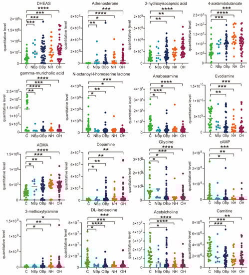 Next, the common differential metabolite levels in the four groups were compared, mainly divided into lipid and non-lipid substances. We drew the corresponding scatter plots as shown in Figure 2. Obviously, the lipid metabolites DHEAS, adrenosterone, 2-hydroxyisocaproic acid and gamma-muricholic acid increased/decreased most significantly in the OH group, followed by the OBp group, compared with the control group. It can be seen that the lipid metabolism disorder is more serious when overweight combined with high Hcy. Similarly, n-octanoyl-l-homoserine lactone, anabasamine, DL-isoleucine and carnitine were more significantly altered in the OBp and OH groups. In addition, 4-acetamidobutanoate, evodiamine, ADMA, dopamine, glycine, cAMP and acetylcholine changed more significantly in the NH and OH groups, especially ADMA, which increased most significantly in the OH group (p < 0.0001). The results suggested that all hypertensive children had different degrees of lipid metabolism disorder, especially in the OBp and OH groups when the increase/decrease in lipids and lipid-like molecules was more significant. However, some metabolites are specific to a certain group, so we analyzed each hypertension group separately.