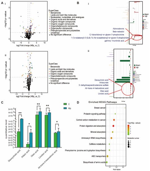 Analysis of differential metabolites between NBp vs. C. (A) Volcanic maps of positive (i) and negative (ii) ion modes. Points on the right half of volcano plot represent up-regulated metabolites satisfying FC > 1.5, p < 0.05, and points on the left half represent down-regulated metabolites satisfying FC < 0.67, p < 0.05, and black points on behalf of non-differential metabolites. (B) (i,ii) Bar graphs of the positive and negative ion modes. The abscissa indicates the fold change (FC). Red bars on behalf of up-regulated metabolites satisfying FC > 1, p < 0.05, green bars on behalf of down-regulated metabolites satisfying FC < 1, p < 0.05. The ordinate represents significantly distinctive metabolites. Local enlarged view for lipids and lipid-like molecules. (C) Differential metabolites unique to the NBp group. (* p < 0.05, ** p < 0.01). (D) KEGG pathway enrichment bubble diagram. The vertical axis represents the KEGG metabolic pathway, and the horizontal axis represents the rich factors (the ratio of the number of differential metabolites to the number of annotated metabolites in this pathway). The redder the circle color, the smaller the p-value of enrichment analysis and the higher the channel significance level.