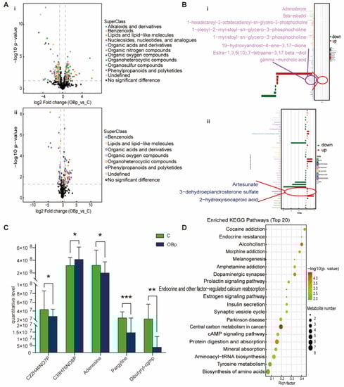 Analysis of differential metabolites between OBp vs. C. (A) Volcanic maps of positive (i) and negative (ii) ion modes. Points on the right half of volcano plot represent up-regulated metabolites satisfying FC > 1.5, p < 0.05, and points on the left half represent down-regulated metabolites satisfying FC < 0.67, p < 0.05, and black points on behalf of non-differential metabolites. (B) (i,ii) Bar graphs of the positive and negative ion modes. The abscissa indicates the fold change (FC). Red bars on behalf of up-regulated metabolites satisfying FC > 1, p < 0.05, green bars on behalf of down-regulated metabolites satisfying FC < 1, p < 0.05. The ordinate represents significantly distinctive metabolites. Local enlarged view for lipids and lipid-like molecules. (C) C22H46NO7P: 1-myristoyl-sn-glycero-3-phosphocholine. C39H76NO8P: 1-hexadecanoyl-2-octadecadienoyl-sn-glycero-3-phosphocholine. Differential metabolites unique to the to the OBp group. (* p < 0.05, ** p < 0.01, *** p < 0.001). (D) KEGG pathway enrichment bubble diagram. The vertical axis represents the KEGG metabolic pathway, and the horizontal axis represents the rich factors (the ratio of the number of differential metabolites to the number of annotated metabolites in this pathway). The redder the circle color, the smaller the p-value of enrichment analysis and the higher the channel significance level.