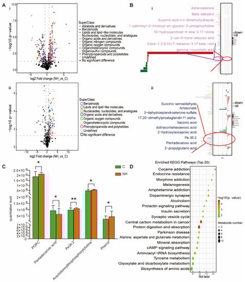Analysis of differential metabolites between NH vs. C. (A) Volcano plot of positive (i) and negative (ii) ion modes. Points on the right half of volcano plot represent up-regulated metabolites satisfying FC > 1.5, p < 0.05, and the points on the left half represent down-regulated metabolites satisfying FC < 0.67, p < 0.05, and black points on behalf of non-differential metabolites. (B) (i,ii) Bar graphs of the positive and negative ion modes. The abscissa indicates the fold change (FC). Red bars on behalf of up-regulated metabolites satisfying FC > 1, p < 0.05, green bars on behalf of down-regulated metabolites satisfying FC < 1, p < 0.05. The ordinate represents significantly distinctive metabolites. Local enlarged view for lipids and lipid-like molecules. (C) POPC: 1-palmitoyl-2-linoleoyl-sn-glycero-3-phosphocholine. Differential metabolites unique to the to the NH group. (* p < 0.05, ** p < 0.01). (D) KEGG pathway enrichment bubble diagram. The vertical axis represents the KEGG metabolic pathway, and the horizontal axis represents the rich factors (the ratio of the number of differential metabolites to the number of annotated metabolites in this pathway). The redder the circle color, the smaller the p-value of enrichment analysis and the higher the channel significance level.