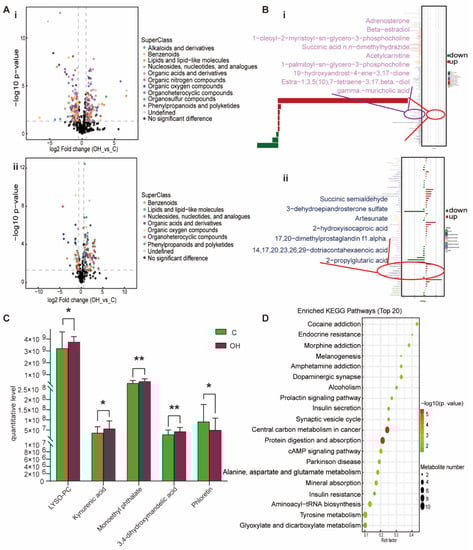 Analysis of differential metabolites between OH vs. C. (A) Volcano plot of positive (i) and negative (ii) ion modes. Points on the right half of volcano plot represent up-regulated metabolites satisfying FC > 1.5, p < 0.05, and the points on the left half represent down-regulated metabolites satisfying FC < 0.67, p < 0.05, and black points on behalf of non-differential metabolites. (B) (i,ii) Bar graphs of the positive and negative ion modes. The abscissa indicates the fold change (FC). Red bars on behalf of up-regulated metabolites satisfying FC > 1, p < 0.05, green bars on behalf of down-regulated metabolites satisfying FC < 1, p < 0.05. The ordinate represents significantly distinctive metabolites. Local enlarged view for lipids and lipid-like molecules. (C) LYSO-PC: 1-palmitoyl-sn-glycero-3-phosphocholine. Differential metabolites unique to the to the OH group. (* p < 0.05, ** p < 0.01). (D) KEGG pathway enrichment bubble diagram. The vertical axis represents the KEGG metabolic pathway, and the horizontal axis represents the rich factors (the ratio of the number of differential metabolites to the number of annotated metabolites in this pathway). The redder the circle color, the smaller the p-value of enrichment analysis and the higher the channel significance level.
