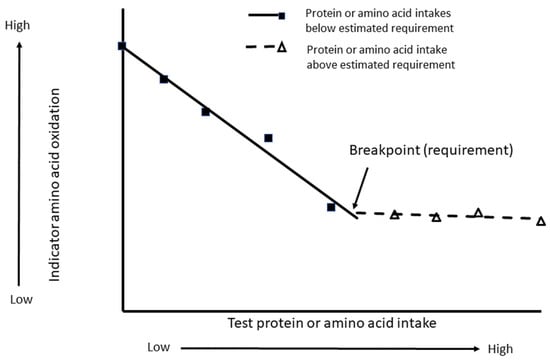 Given the technical difficulties of performing nitrogen balance studies, alternative methods of estimating amino acid or protein requirements have been employed. One of these is the indicator amino acid oxidation (IAAO) method. This method was developed in the 1980s by Ball and Bayley [,,,] to determine amino acid requirements in growing piglets and was later adapted for measurement of amino acid requirements in humans []. The principle of this method is depicted in Figure 1 and has been previously reviewed [,]. In essence, a diet deficient in a particular essential amino acid (aka the limiting amino acid) restricts protein synthesis. As such, the supply of essential amino acids other than the limiting amino acid exceeds their incorporation into protein. Given that amino acids are not stored in the body, oxidation of the other essential amino acids increases. In the IAAO method, a stable carbon isotope of an βindicatorβ amino acid, typically phenylalanine, can be administered to human subjects along with diets that vary in amounts of protein, or the amino acid of interest and the excretion of labeled carbon dioxide can be monitored in the breath as a measure of oxidation. As the intake of the test amino acid approaches the requirement, oxidation of the indicator amino acid steadily decreases until it reaches a nadir. Further increases in the test amino acid intake result in no further decreases in the oxidation of the indicator amino acid. As with the nitrogen balance technique, biphasic linear regression can be applied, resulting in one line with significant negative slope (test amino acid intakes below the requirement) and one line with an essentially zero slope (test amino acid intakes above the requirement). The point at which these two lines converge is termed the βbreak pointβ and represents the amino acid requirement.