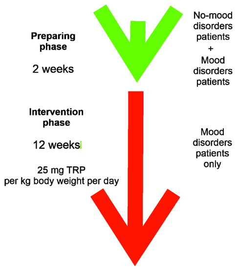 Schematic representation of the nature of dietary intervention. Two weeks before the beginning of the trial (preparation phase, green arrow) all (with and without mood disorders) patients started to monitor and daily record their diet without any changes in their eating habits. After that period, the intervention phase (red arrow) began, which lasted 12 weeks and in which the mood disorder patients only were enrolled. They were instructed to change their diet according to a dietician’s recommendation. New diet contained 25 mg of tryptophan (TRP) per kg of body weight per day.